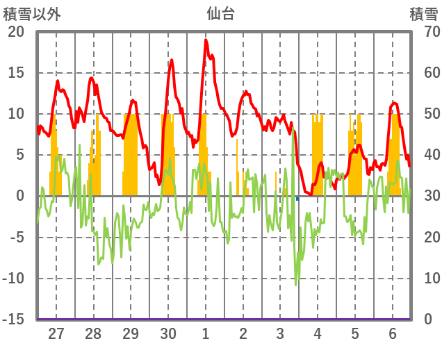 | 日 | 時 | 気温 | 降水 | 風向/風速 | 日照 | 積雪 | 降雪 |