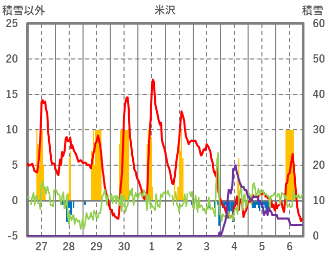 | 日 | 時 | 気温 | 降水 | 風向/風速 | 日照 | 積雪 | 降雪 |