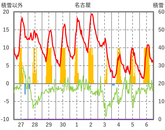 | 日 | 時 | 気温 | 降水 | 風向/風速 | 日照 | 積雪 | 降雪 |