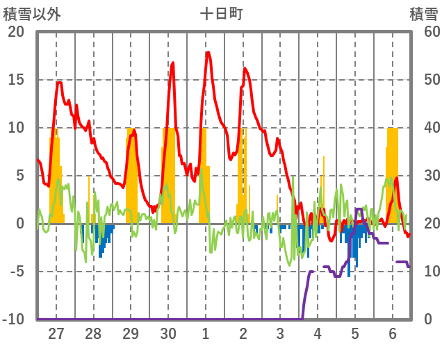 | 日 | 時 | 気温 | 降水 | 風向/風速 | 日照 | 積雪 | 降雪 |