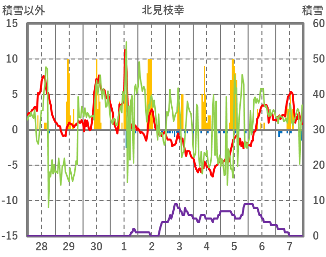 | 日 | 時 | 気温 | 降水 | 風向/風速 | 日照 | 積雪 | 降雪 |