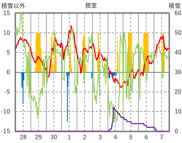 | 日 | 時 | 気温 | 降水 | 風向/風速 | 日照 | 積雪 | 降雪 |