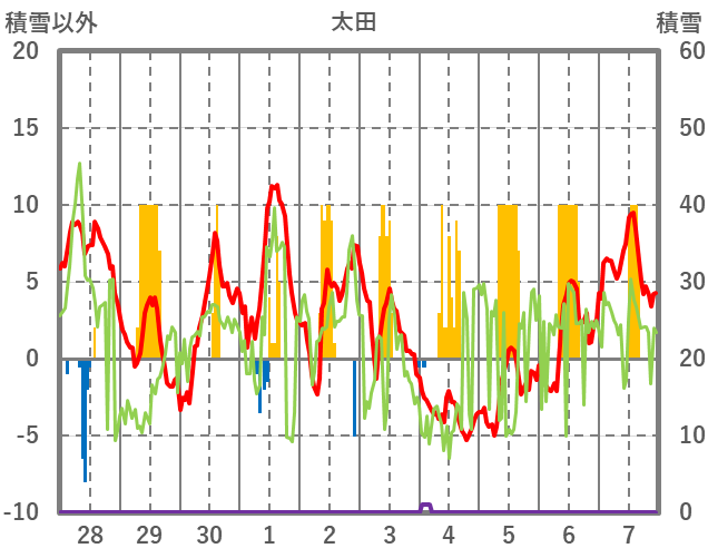| 日 | 時 | 気温 | 降水 | 風向/風速 | 日照 | 積雪 | 降雪 |
