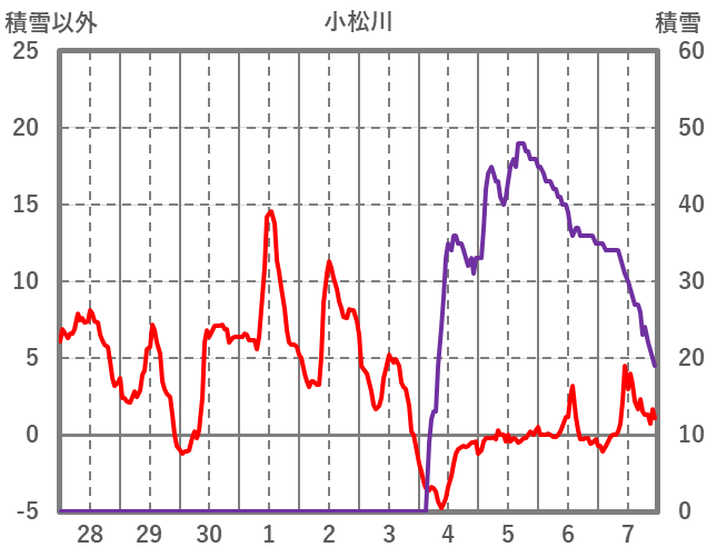 | 日 | 時 | 気温 | 降水 | 風向/風速 | 日照 | 積雪 | 降雪 |
