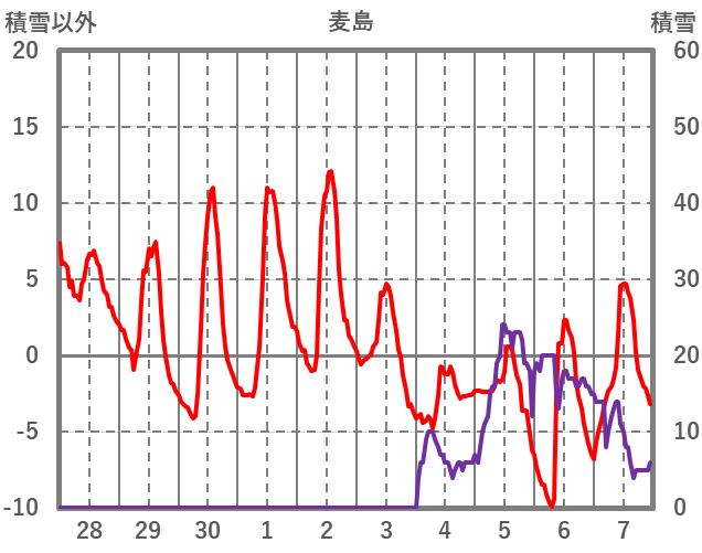 | 日 | 時 | 気温 | 降水 | 風向/風速 | 日照 | 積雪 | 降雪 |