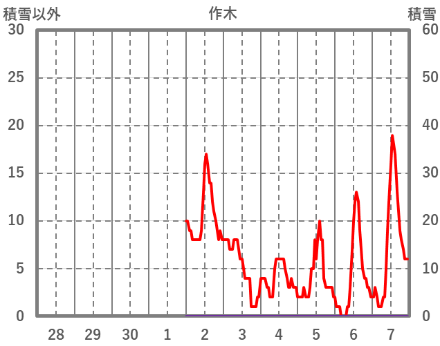 | 日 | 時 | 気温 | 降水 | 風向/風速 | 日照 | 積雪 | 降雪 |