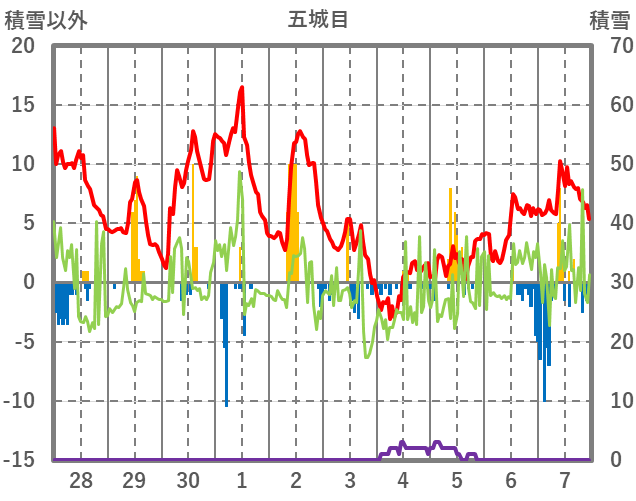 | 日 | 時 | 気温 | 降水 | 風向/風速 | 日照 | 積雪 | 降雪 |