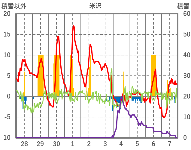 | 日 | 時 | 気温 | 降水 | 風向/風速 | 日照 | 積雪 | 降雪 |