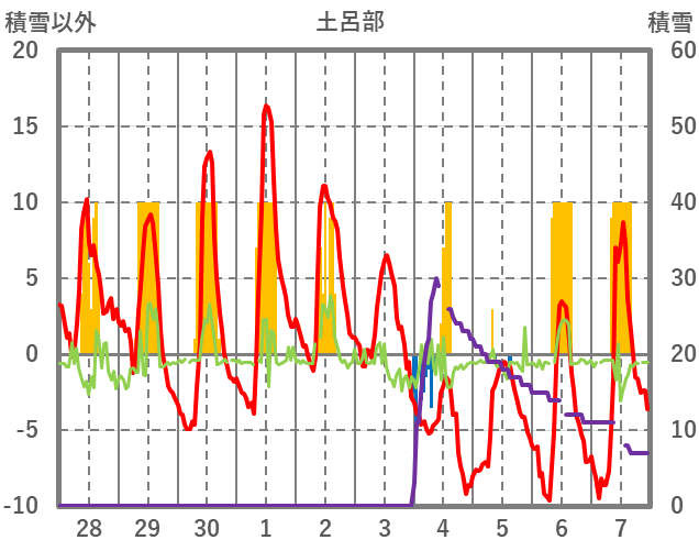 | 日 | 時 | 気温 | 降水 | 風向/風速 | 日照 | 積雪 | 降雪 |
