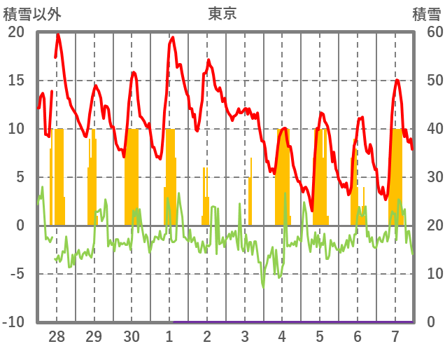 | 日 | 時 | 気温 | 降水 | 風向/風速 | 日照 | 積雪 | 降雪 |