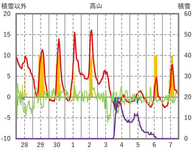 | 日 | 時 | 気温 | 降水 | 風向/風速 | 日照 | 積雪 | 降雪 |