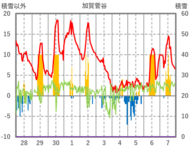 | 日 | 時 | 気温 | 降水 | 風向/風速 | 日照 | 積雪 | 降雪 |