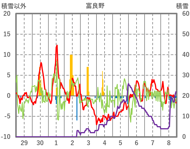 | 日 | 時 | 気温 | 降水 | 風向/風速 | 日照 | 積雪 | 降雪 |