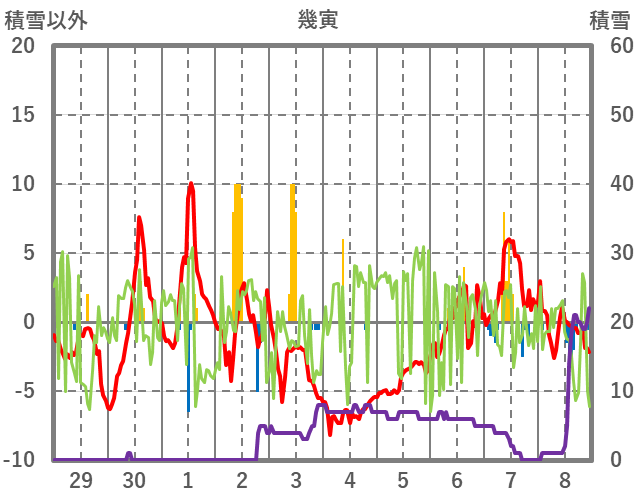 | 日 | 時 | 気温 | 降水 | 風向/風速 | 日照 | 積雪 | 降雪 |