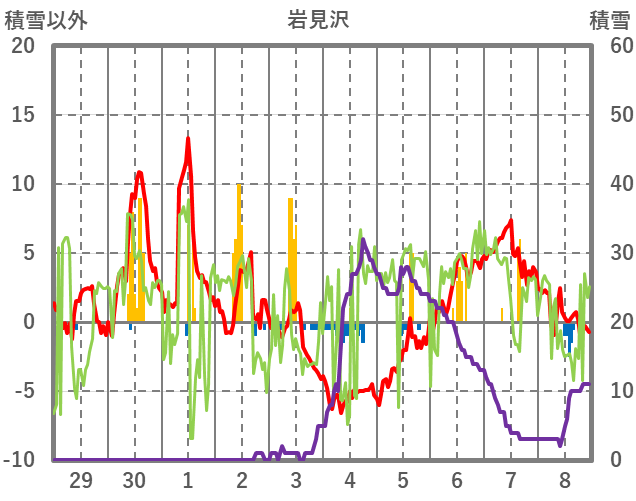 | 日 | 時 | 気温 | 降水 | 風向/風速 | 日照 | 積雪 | 降雪 |