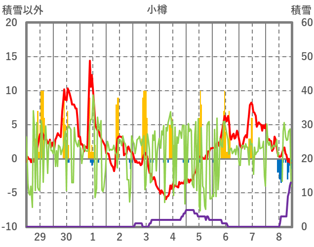 | 日 | 時 | 気温 | 降水 | 風向/風速 | 日照 | 積雪 | 降雪 |