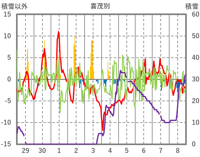 | 日 | 時 | 気温 | 降水 | 風向/風速 | 日照 | 積雪 | 降雪 |