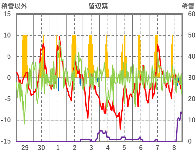 | 日 | 時 | 気温 | 降水 | 風向/風速 | 日照 | 積雪 | 降雪 |