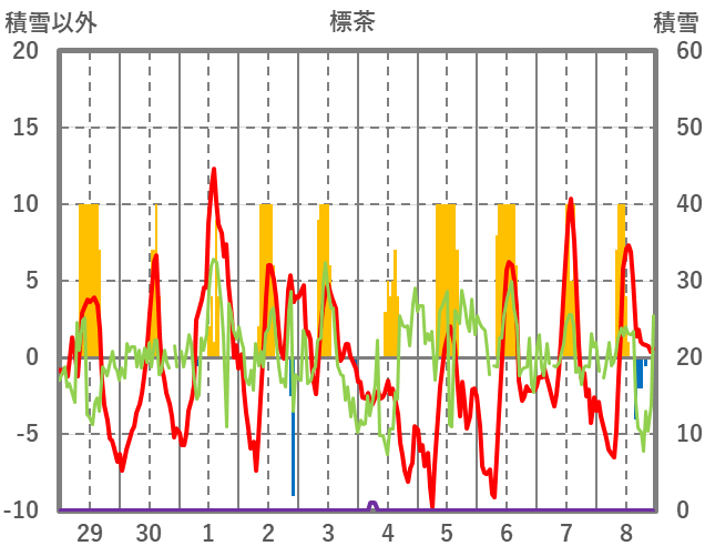 | 日 | 時 | 気温 | 降水 | 風向/風速 | 日照 | 積雪 | 降雪 |