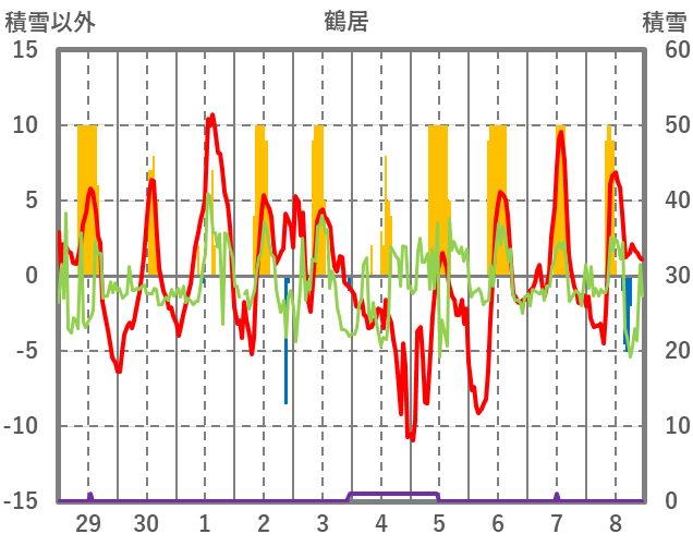 | 日 | 時 | 気温 | 降水 | 風向/風速 | 日照 | 積雪 | 降雪 |
