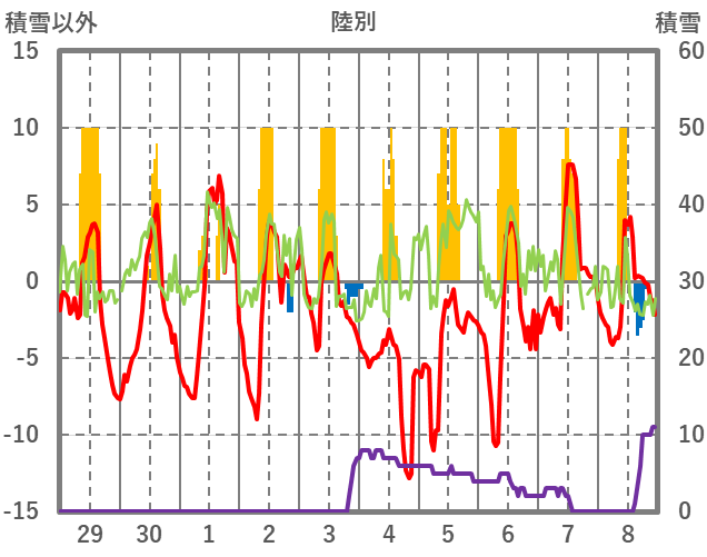 | 日 | 時 | 気温 | 降水 | 風向/風速 | 日照 | 積雪 | 降雪 |