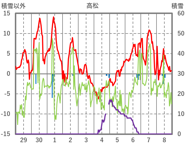 | 日 | 時 | 気温 | 降水 | 風向/風速 | 日照 | 積雪 | 降雪 |