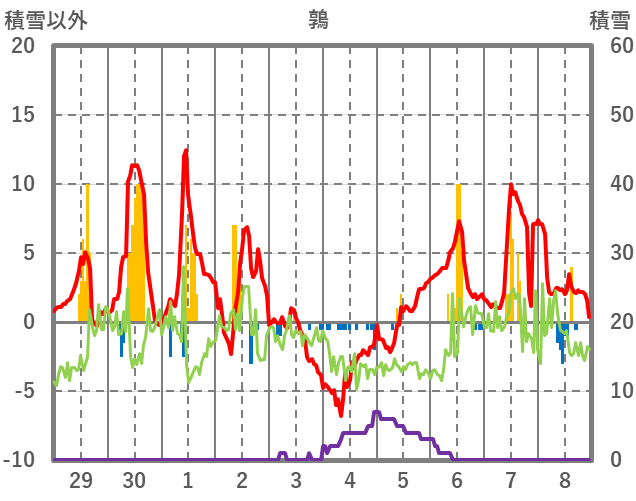 | 日 | 時 | 気温 | 降水 | 風向/風速 | 日照 | 積雪 | 降雪 |