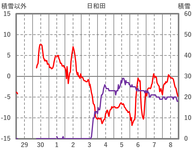 | 日 | 時 | 気温 | 降水 | 風向/風速 | 日照 | 積雪 | 降雪 |