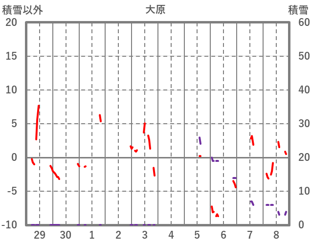 | 日 | 時 | 気温 | 降水 | 風向/風速 | 日照 | 積雪 | 降雪 |