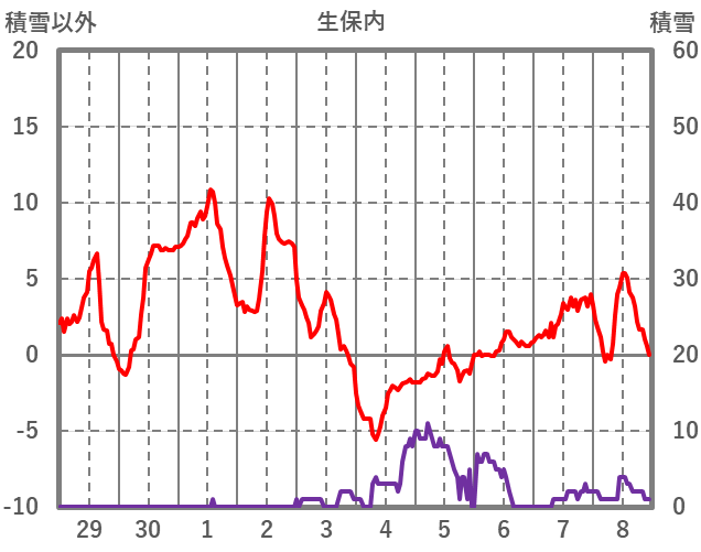 | 日 | 時 | 気温 | 降水 | 風向/風速 | 日照 | 積雪 | 降雪 |