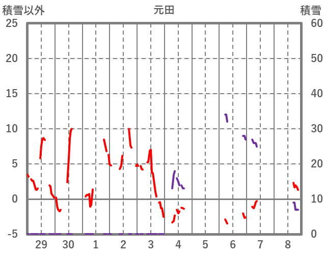 | 日 | 時 | 気温 | 降水 | 風向/風速 | 日照 | 積雪 | 降雪 |