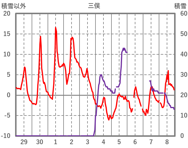 | 日 | 時 | 気温 | 降水 | 風向/風速 | 日照 | 積雪 | 降雪 |
