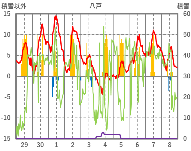 | 日 | 時 | 気温 | 降水 | 風向/風速 | 日照 | 積雪 | 降雪 |