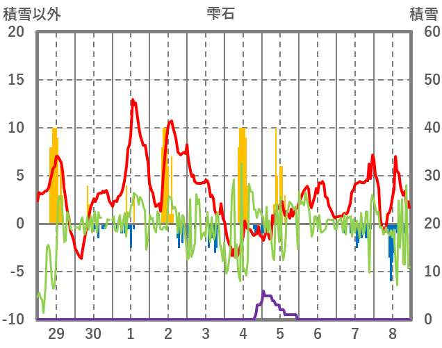 | 日 | 時 | 気温 | 降水 | 風向/風速 | 日照 | 積雪 | 降雪 |