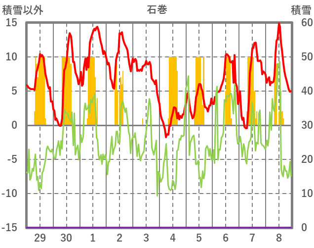| 日 | 時 | 気温 | 降水 | 風向/風速 | 日照 | 積雪 | 降雪 |