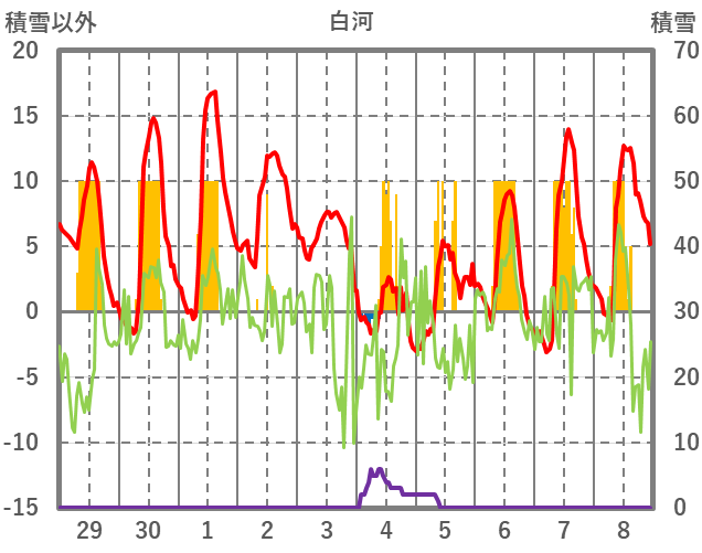 | 日 | 時 | 気温 | 降水 | 風向/風速 | 日照 | 積雪 | 降雪 |