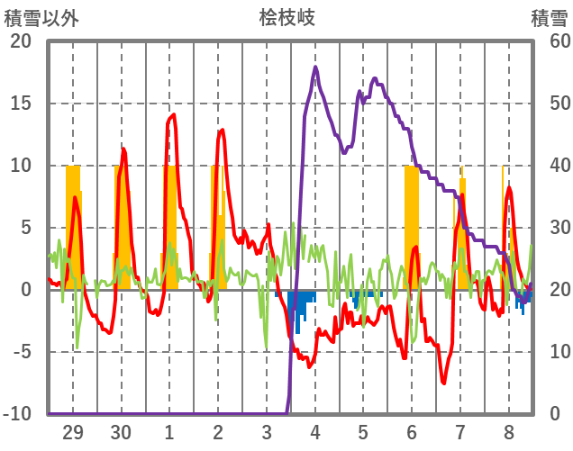 | 日 | 時 | 気温 | 降水 | 風向/風速 | 日照 | 積雪 | 降雪 |