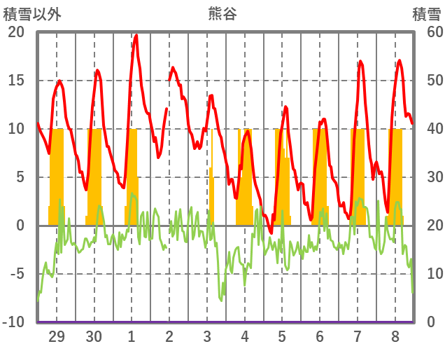 | 日 | 時 | 気温 | 降水 | 風向/風速 | 日照 | 積雪 | 降雪 |