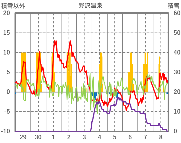 | 日 | 時 | 気温 | 降水 | 風向/風速 | 日照 | 積雪 | 降雪 |
