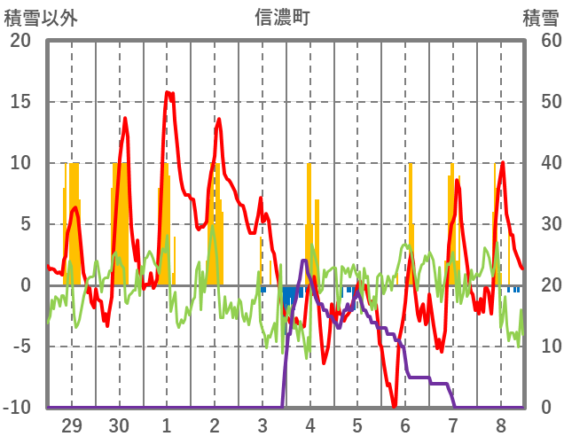 | 日 | 時 | 気温 | 降水 | 風向/風速 | 日照 | 積雪 | 降雪 |