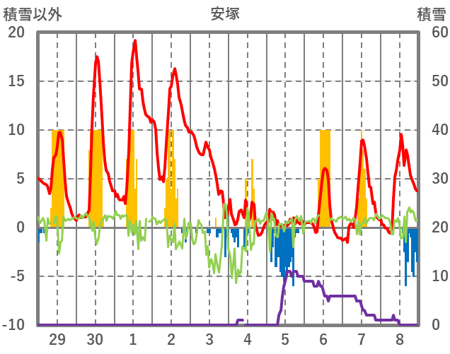 | 日 | 時 | 気温 | 降水 | 風向/風速 | 日照 | 積雪 | 降雪 |