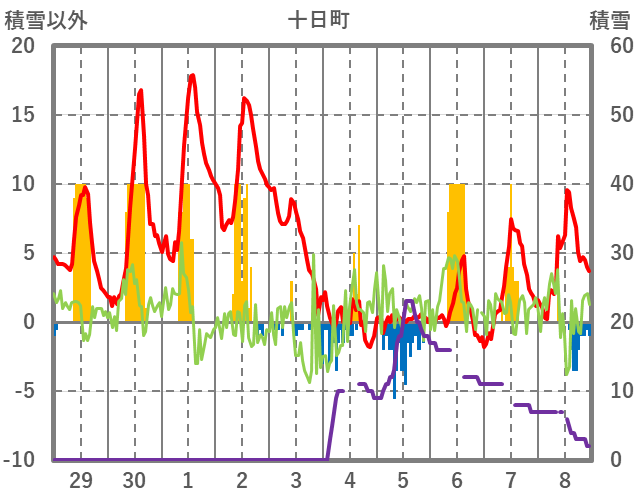 | 日 | 時 | 気温 | 降水 | 風向/風速 | 日照 | 積雪 | 降雪 |