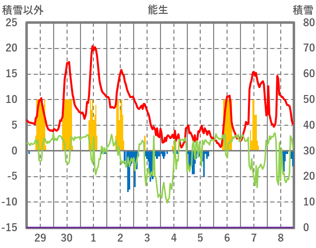 | 日 | 時 | 気温 | 降水 | 風向/風速 | 日照 | 積雪 | 降雪 |