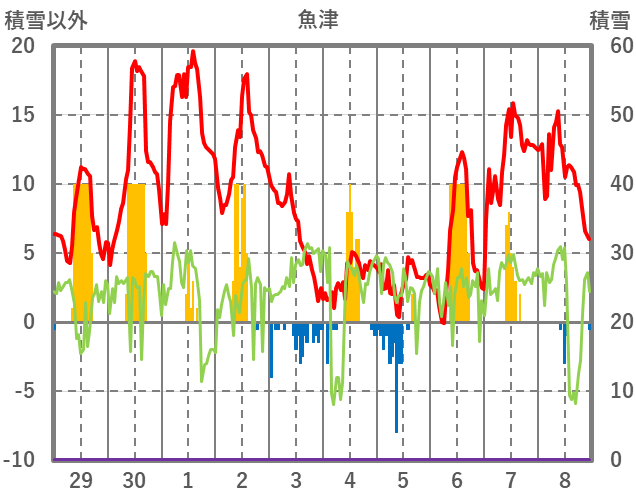 | 日 | 時 | 気温 | 降水 | 風向/風速 | 日照 | 積雪 | 降雪 |