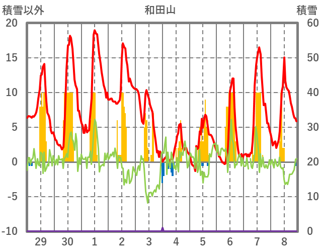 | 日 | 時 | 気温 | 降水 | 風向/風速 | 日照 | 積雪 | 降雪 |