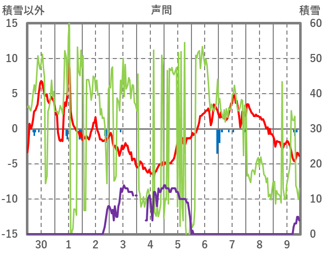 | 日 | 時 | 気温 | 降水 | 風向/風速 | 日照 | 積雪 | 降雪 |