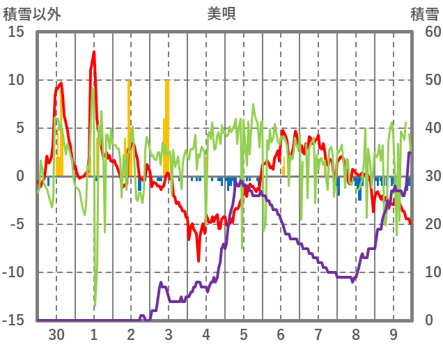 | 日 | 時 | 気温 | 降水 | 風向/風速 | 日照 | 積雪 | 降雪 |