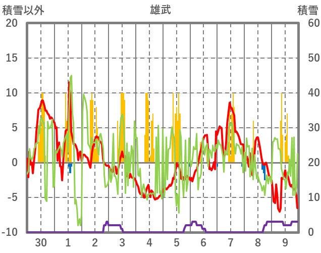 | 日 | 時 | 気温 | 降水 | 風向/風速 | 日照 | 積雪 | 降雪 |