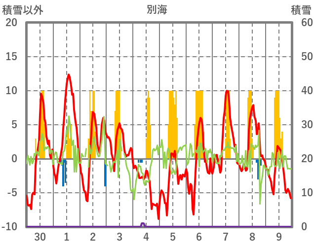 | 日 | 時 | 気温 | 降水 | 風向/風速 | 日照 | 積雪 | 降雪 |