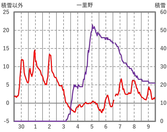 | 日 | 時 | 気温 | 降水 | 風向/風速 | 日照 | 積雪 | 降雪 |